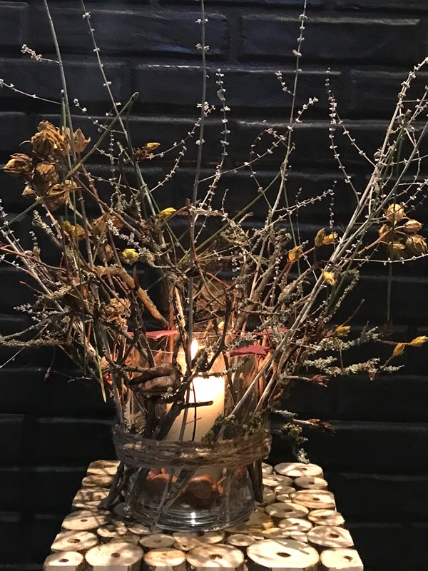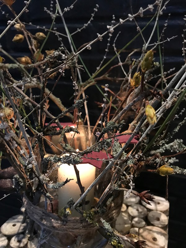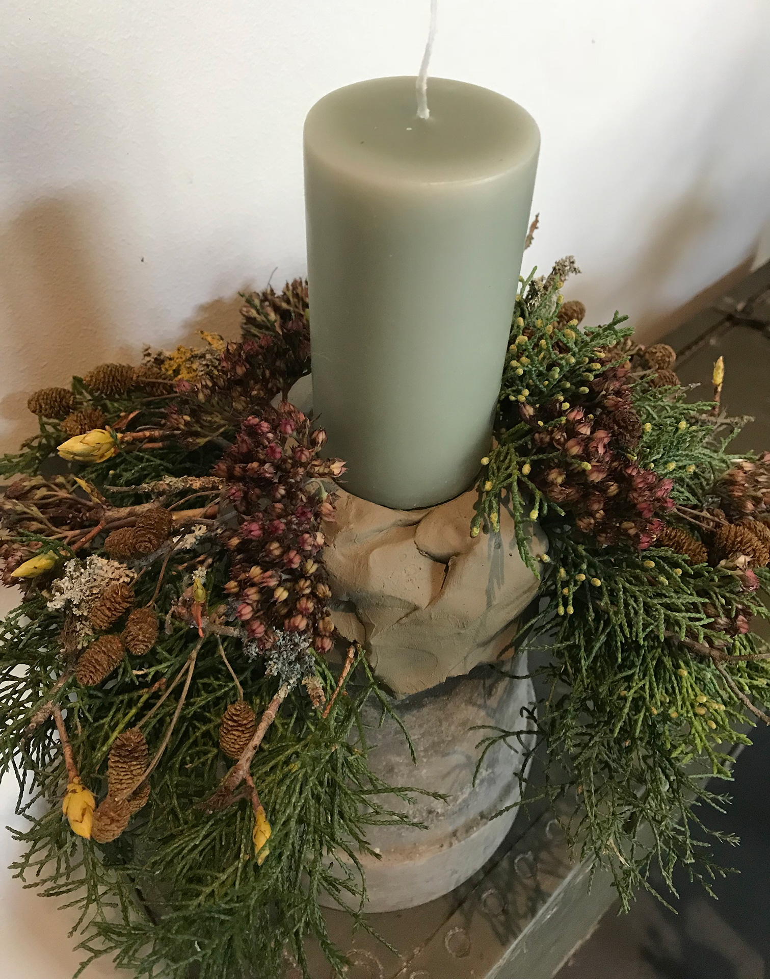 2. Gran stikkes i – start nedefra og rundt om hele krukken og brug her længden på grannet. Herefter sættes sankthansurt, grene og kogler sporadisk – slut af med at bruge gran til at dække huller. Husk at jo tættere på lyset jo kortere stilke – derved opnåes den flotte form.