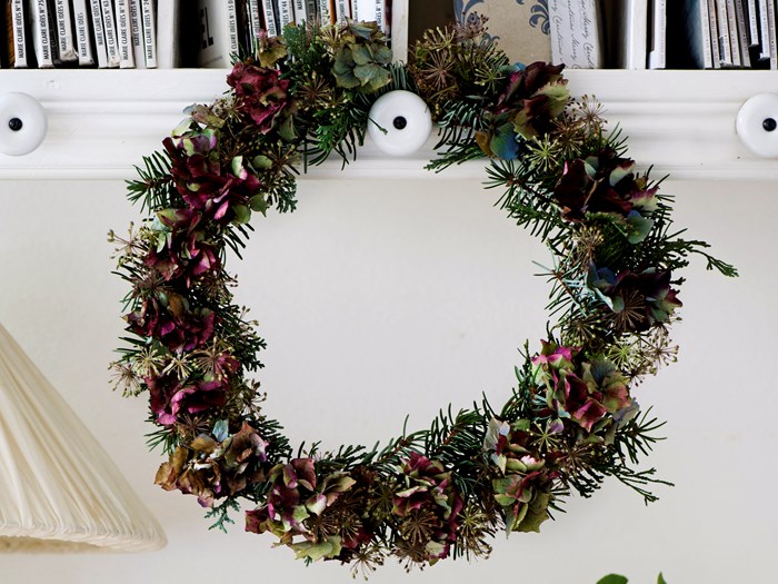 Denne fine krans kan pynte på hoveddøren op til jul. Hortensia, gran og ædelcypres har mange i haven og eukalyptusblomster kan købes hos blomsterhandleren.