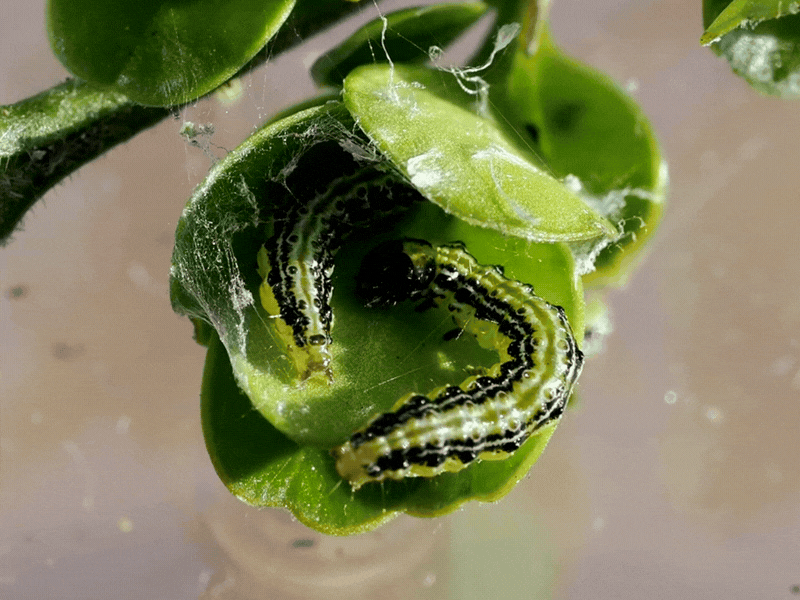 Larverne er meget aktive - som det kan ses af videoen, som Magnus Gammelgaard har optaget i begyndelsen af april - og han påpeger, at de har timet det med fremkomsten af buksbommens fine nye skud.
