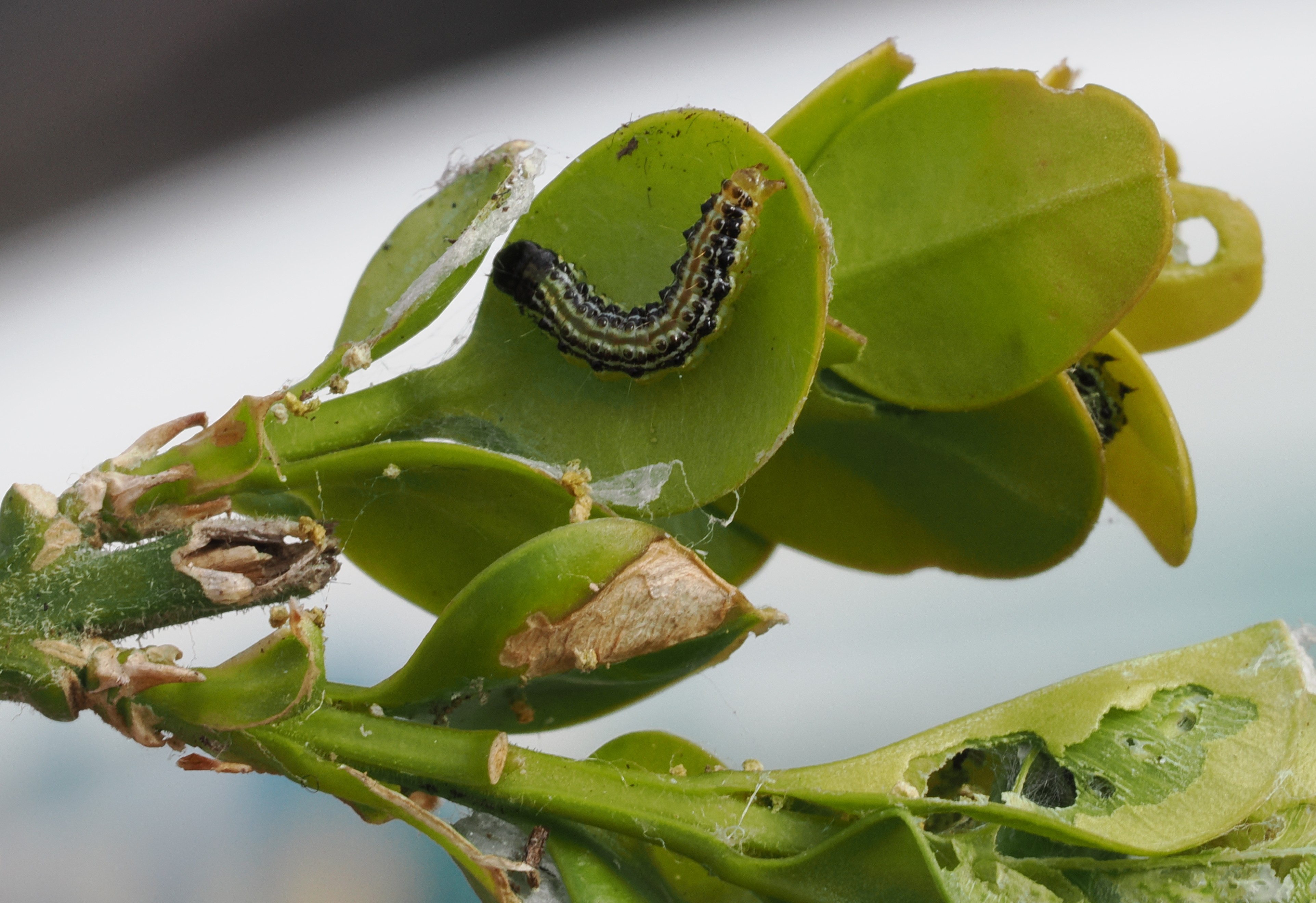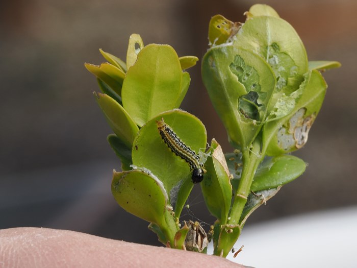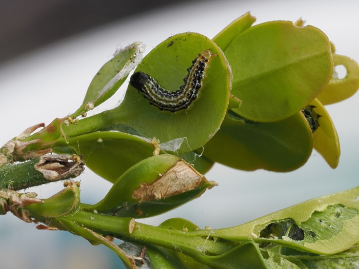 De kan spise bladene på en buksbom i løbet af en uges tid, så går de i gang med grenene og herefter er det slut. Din buksbom kommer ikke igen. Den er færdig.