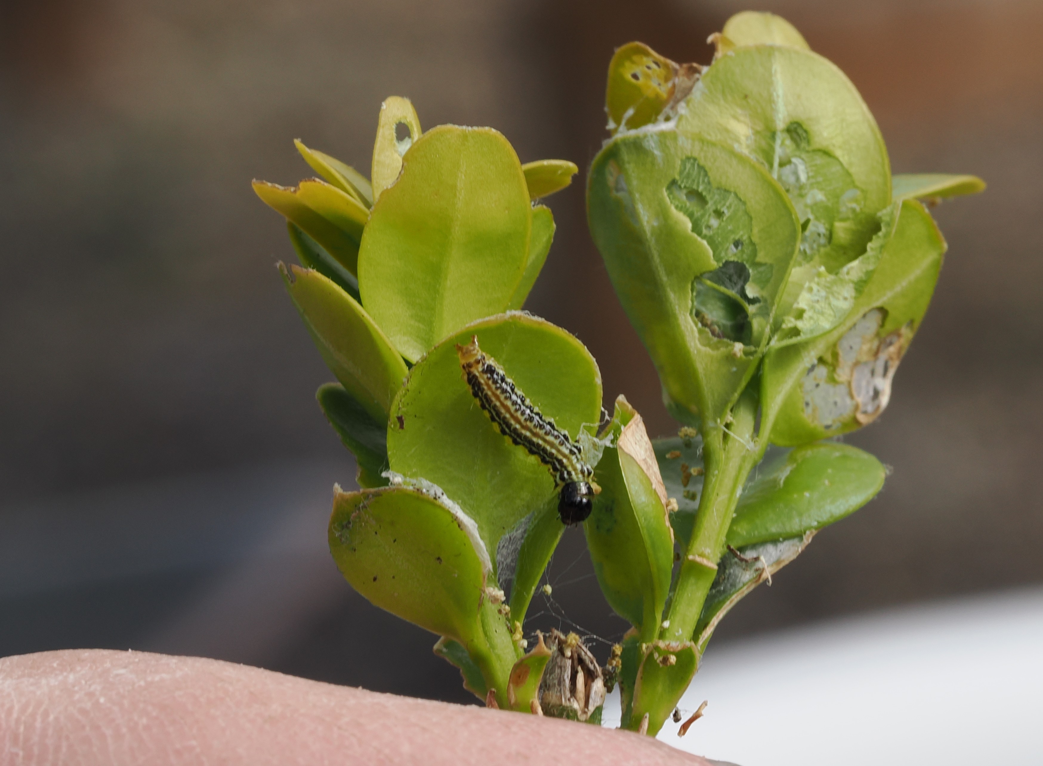 Buksbomhalvmøllets larver er spottet i slutningen af marts i det sydsjællandske, så til trods for en ganske hård vinter, er larverne overvintret, og er allerede nu i fuld gang med årets ædegilde.