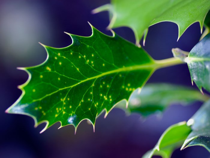 Kristtornens smukke blade kan være ganske oversået med små gule prikker. De skyldes stiksår efter kristtornminerfluer, der suger saft fra bladene, før de lægger æg.