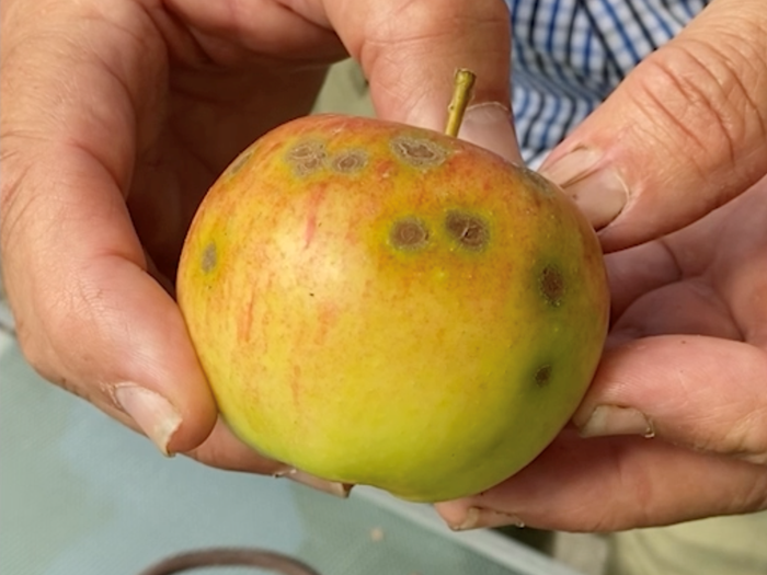 Havens æbler kan rammes af forskellige sygdomme og skadedyr, det ved Haveselskabets ekspert, Magnus Gammelgaard, alt om. Han har samlet æbler ind med forskellige typiske sygdomme og angreb. Selvom et æble har fået en skade, er det langt fra ensbetydende med at æblet må kasseres. Ofte har skaden kun kosmetisk betydning.