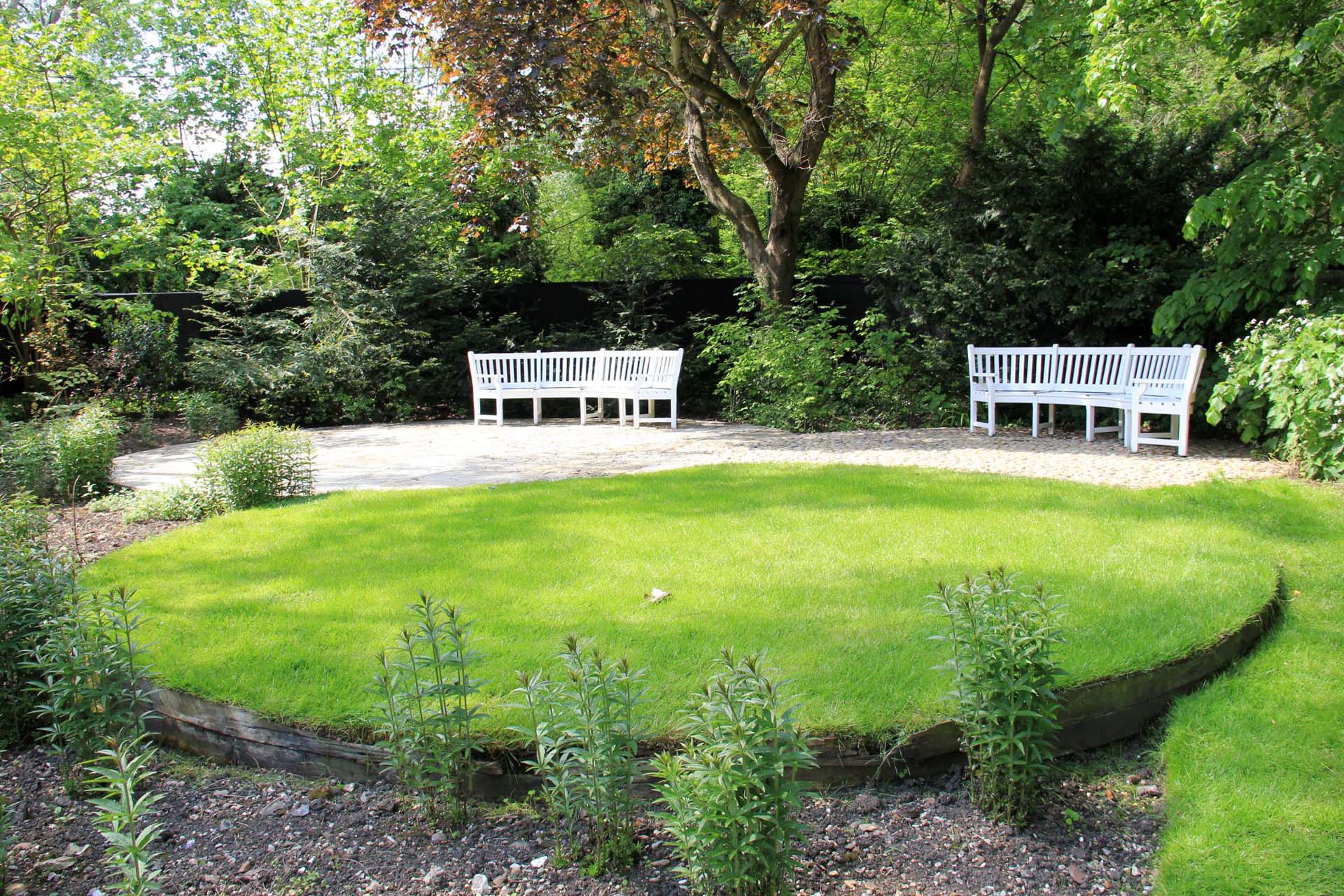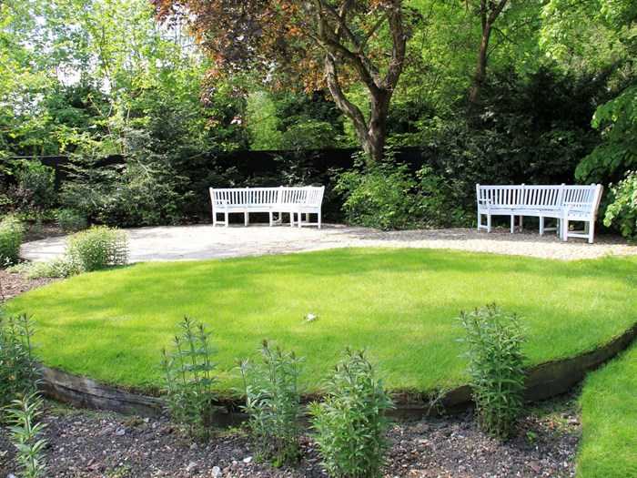 Har du en lille have, eller er din store have opdelt i mindre haverum, kan du anlægge en lille plæne i en stram geometrisk form midt i rummet. En lille cirkelrund, oval eller kvadratisk plæne kan fungere som en pause for øjet og kan fremhæve det der er rundtom. Samtidig kan den geometriske form fremhæve havens formsprog, hvis den gentages andre steder i haven.