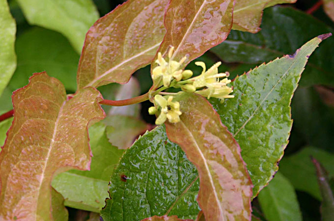 Løvet er let og lysegrønt og giver planten en visuel friskhed, som ikke ses hos ret mange andre buske. De nye blade er svagt rødlige. Da der over en lang periode er både grønne og rødlige blade, giver det planten et lettere broget udtryk.