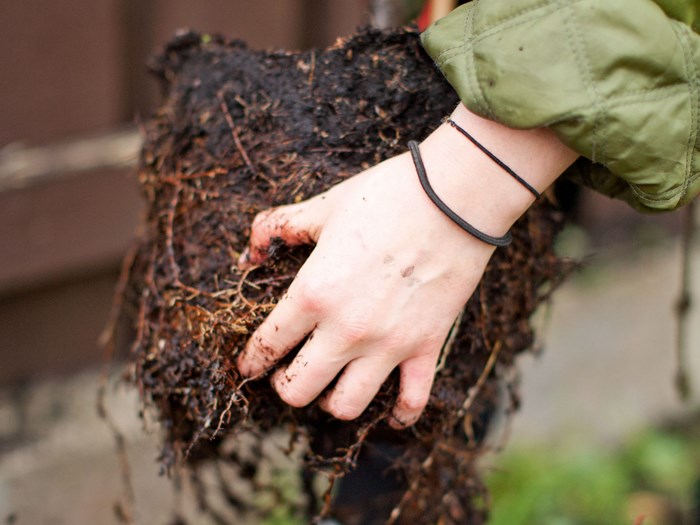 Hvis busken har stået i potte i længere til skal rødderne løsnes, så de har nemmere ved at søge ud i jorden. Bræk rodklumpe forsigtigt fra hinanden i kanten eller skær lodrette snit med en saks.