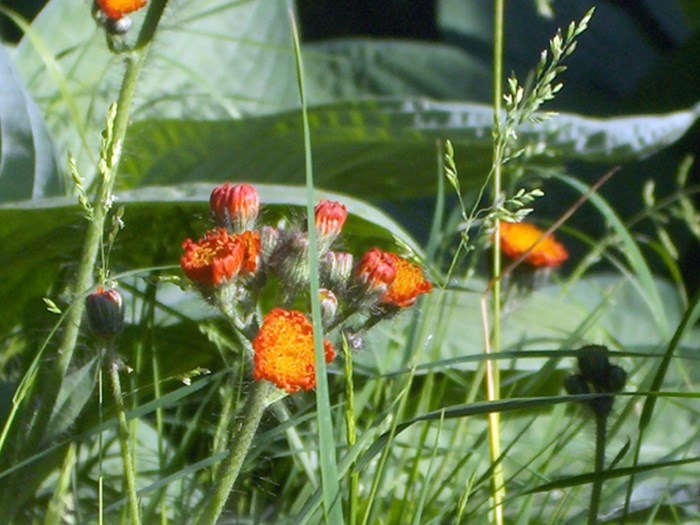 Jeg plantede for et par sæsoner siden et par pomeranshøgeurt i min have. De står i en vild del af græsplænen, hvor de vokser mellem mine hosta af forskellige størrelse. Pomeranshøgeurten har nu bredt sig, så den dukker skødesløst op forskellige steder i hostabeplantningen. Deres blomsterfarve danner flot kontrast til hostaernes dominerende friskgrønne farve. Plantestedet er ikke ideelt, da netop hosta har store, skyggende blade, men indtil videre går det.