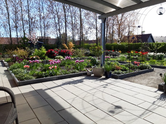 Haven er anlagt, så den har noget at byde på hele året. Her i foråret skal vi nyde godt af de mange påske- og pinseliljer, tulipaner og forårsblomster.