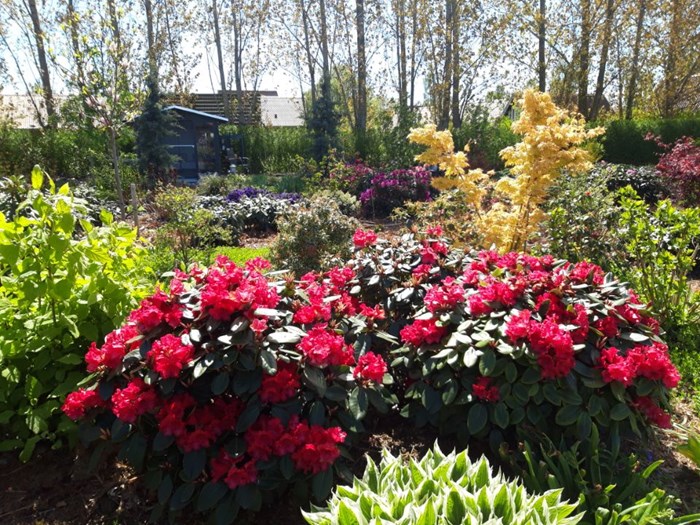I surbundsbedet er nogle af de mange rhododendron og magnolier allerede sprunget ud. Det er også skovbed med mormor/farmorhytte og lille legeområde til børnebørnene at opleve - modsatte ende ligger drivhuset og køkkenbede, som gøres klar. Det hele trækkes sammen med grusgange