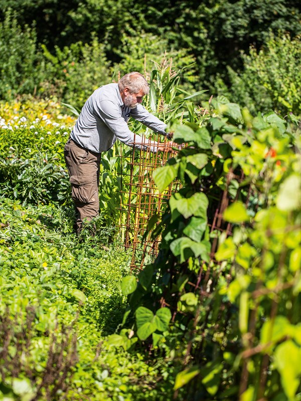 »Som du kan se, så kan jeg komme pænt langt ned bare med en hånd. Det er jo løs jord. Det er jo det, der er glæden, når vi for eksempel trækker pastinakker op.« Omkring ham ligger den store køkkenhave i en lysning mellem træerne. Bedene med den utrolig porøse jord ligger i meget lange rækker ved siden af hinanden. De er til gengæld ikke bredere, end man kan skræve over dem, og det gør det nemt at færdes i køkkenhaven uden at træde på dyrkningsjorden. Og det er et af hovedprincipperne bag gravefri køkkenhave, eller no-dig metoden, som Bo er en varm fortaler for.