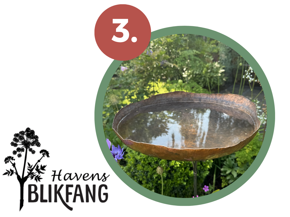 Vind et smut håndlavet fuglebad i kobber. Et dekorativt og unikt smykke til haven. Det håndlavede fuglebad pynter og tilbyder samtidig vand til havens dyreliv. Fuglebadet er håndlavet i Danmark af Havens Blikfang. En håndlavet fod på pind i stål medfølger. Præmien har en værdi af 2195 kr.
