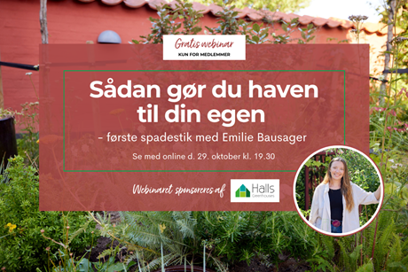 Se med d. 29 oktober når vi får Emilie Bausager i studiet til webinaret: sådan gør du haven til din egen. Se med hjemmefra og glæd dig til en hyggelig aften, hvor du både bliver haveklog og haveglad. Læs mere og tilmeld dig her
