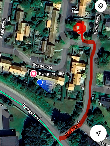 Midgården er husene med gule tage på billedet. Der kan parkeres på Midgårdens gæsteparkering (lige til højre for indkørslen til området, markeret med rødt på billedet.