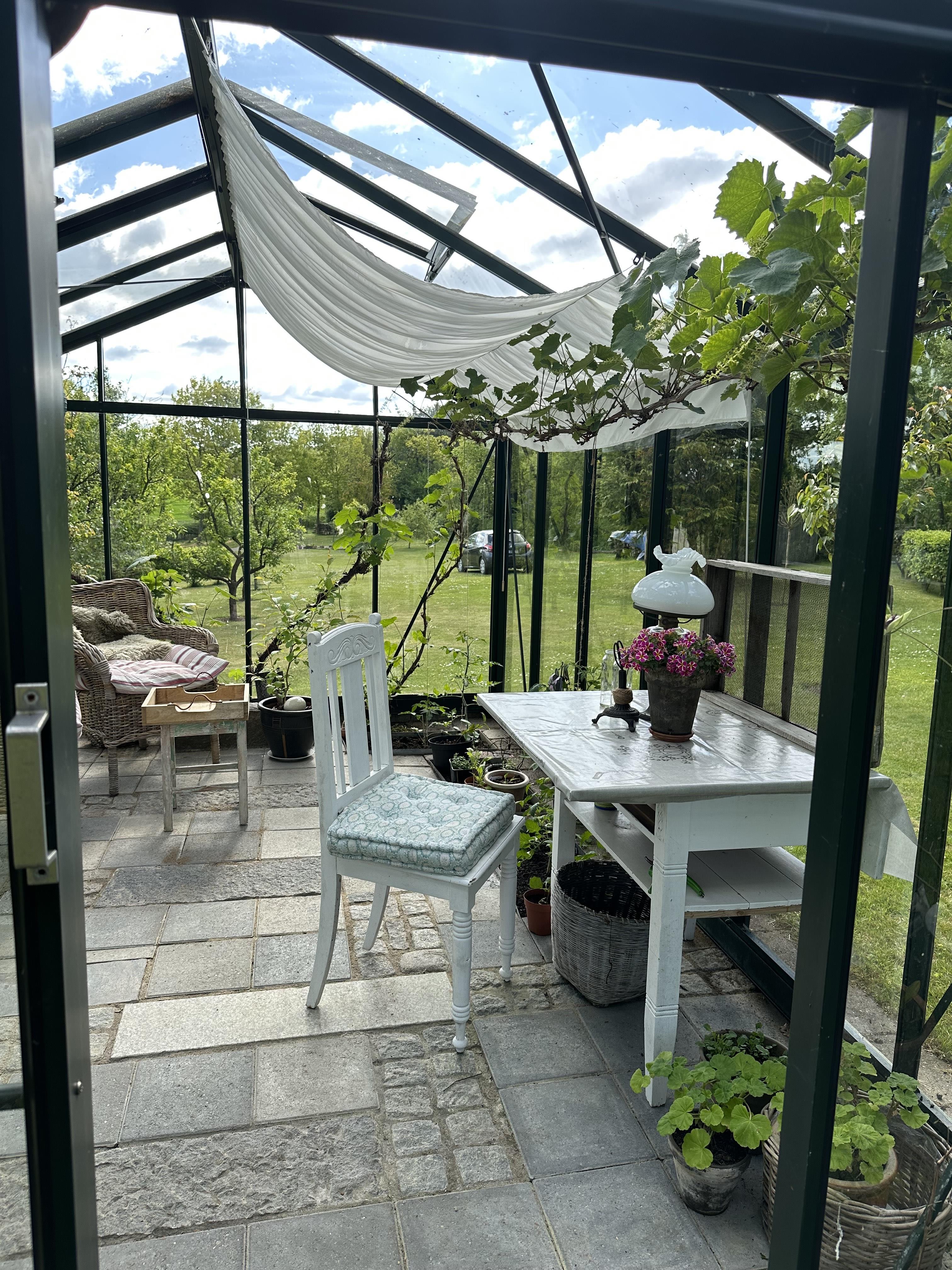En parklignende have med udsigt, bede der er nemme at holde, skov med stier, biodiversitet til bierne i bistaderne på vores grund.