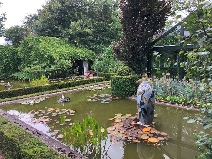 Haven er opdelt i rum, der afgrænses af hække, træer, espalierhegn mm.