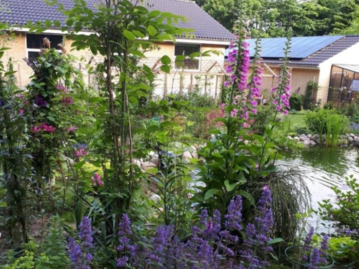 For 5 år sige overtog de huset og haven, hvor der kun var græsplæne, men i dag er det en kuperet have med mange bede, havedam, pergola, udestue og drivhuse. I haven er der selvfølgelig mange Clematis – ca. 650 forskellige – men også Hosta, Liljer, Hortensia og mange andre sjove, spændende og anderledes grønne vækster. Alt i alt en plantesamler have med højt til loftet.