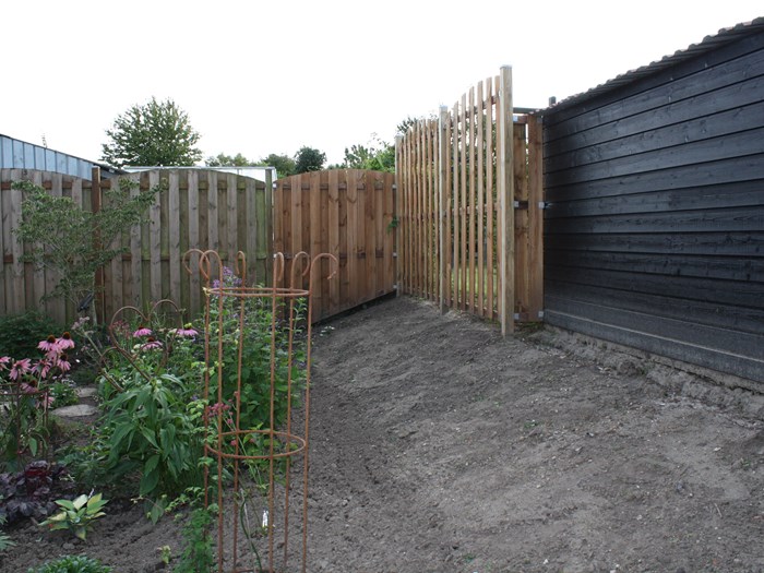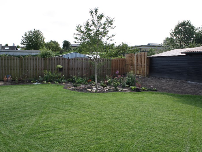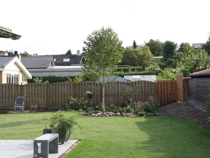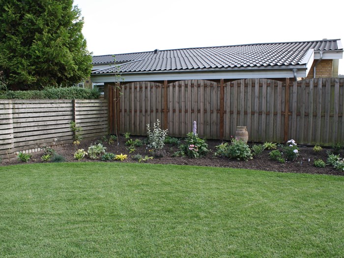 I bunden af haven har jeg lagt skovhaven og staudehaven til mere solelskende planter. Imellem de to områder er der lavet en lille terrasse til en stol eller to.