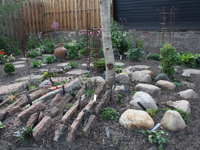 "Mange af de stenbedsplanter jeg har med fra min tidligere have er gået ud, da de har stået alt for vådt i potterne. Jeg har endnu ikke købt så mange alpine planter, da jeg først skal være sikker på at snerlerne er væk.