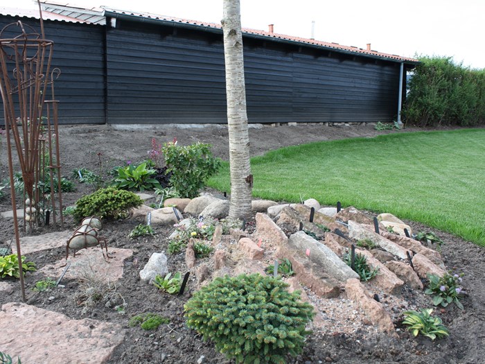 "Tidligere har jeg ikke gjort noget. Men her i den nye have er det noget andet, da jorden var udpint og ikke er blevet gjort noget ved i 30 år. Så efter at entreprenøren havde ryddet grunden, fik vi lavet en jordprøve. Den viste, vi skulle give jorden kalk. Det har vi gjort og vil også gøre det her i efteråret. Jorden er også blevet gødet. De fleste af planterne er blevet plantet i hestekompost, som jeg har fri adgang til, og det kan jeg se planterne godt kan lide."