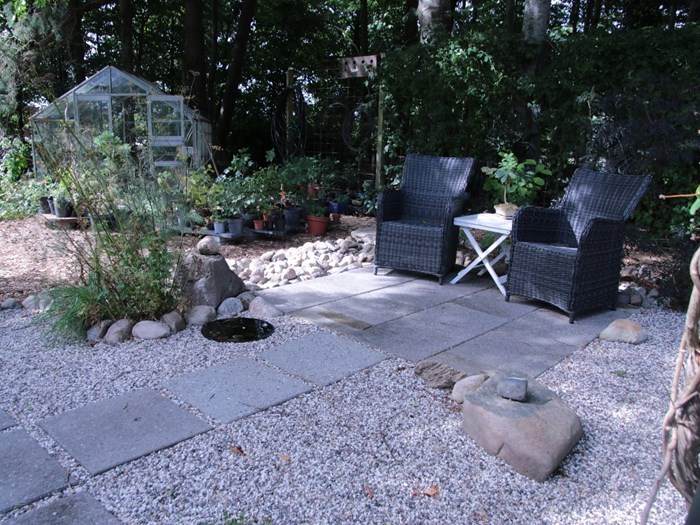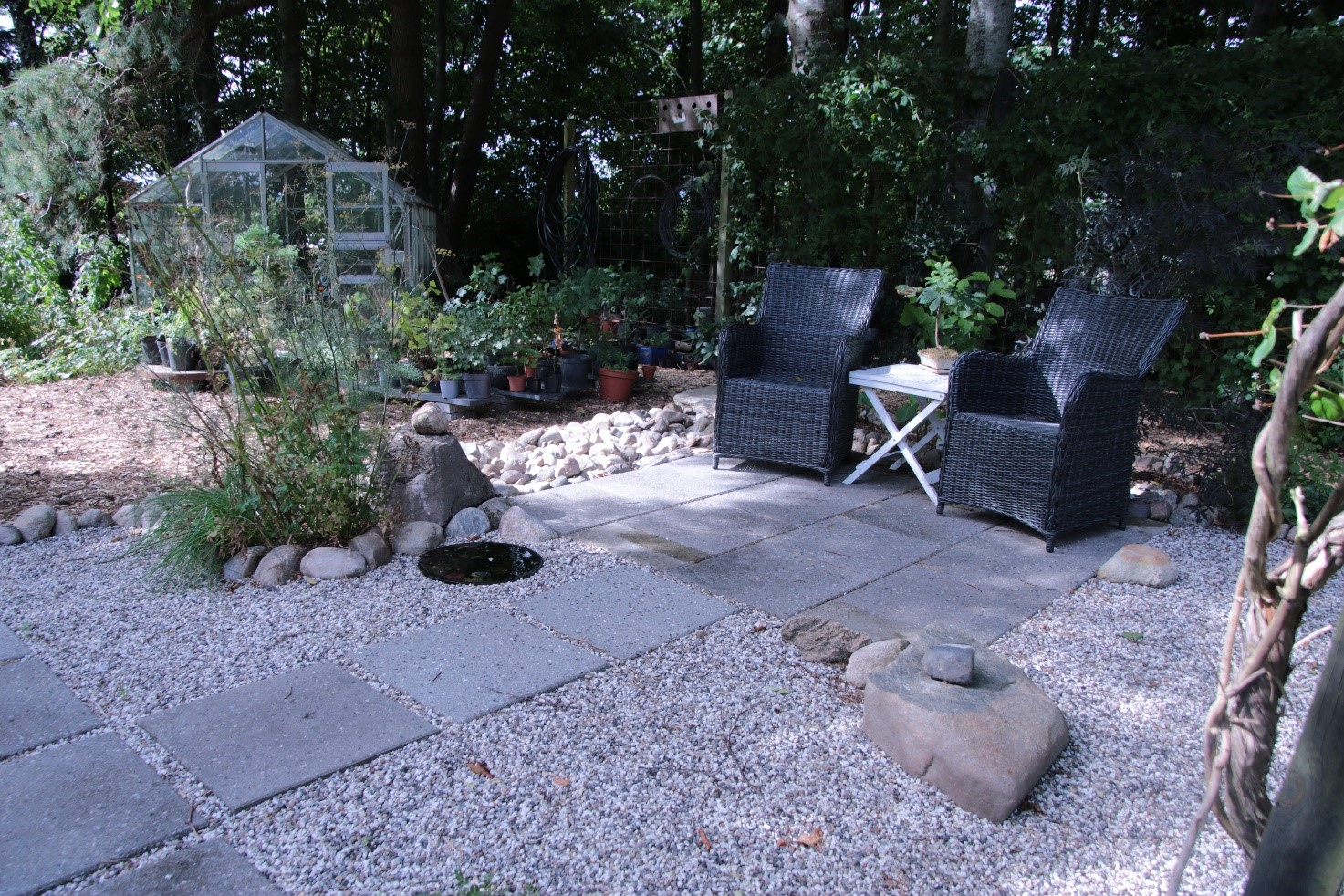 En skovhave med vand og sten. Jeg deler den op i den pæne have på 3-4.000 m2, der holdes relativt stramt med udbredt anvendelse af fiberdug, ærtesten og marksten i alle størrelser, omkranses af den vilde have der primært består af skov. I alt knap 20.000 m2.