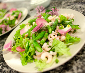 Knæk det nederste af de grønne asparges og kog dem under låg i letsaltet vand i 2-3 min. Afkøles og skæres i lange snitter. Skyl de vilde urter grundigt. Vend derefter urter, asparges og rejer med olie og citronsaft, og smag til med salt og peber.