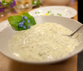 Anret salaten og servér rygeost-dressingen til.