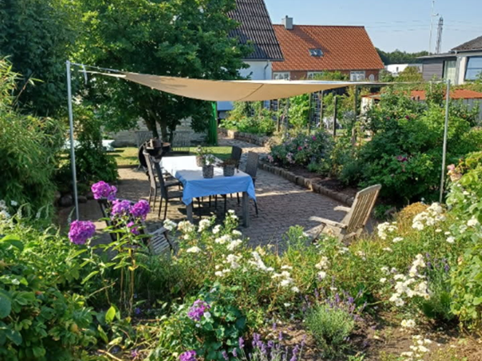 Velkommen til min hyggelige parcelhushave, med små rum, hvor der er plads til at slappe af. Fra de forskellige rum, ses haven fra alle vinkler. Jeg har hjemmebygget et lille orangeri, med plads til blomster og siddeplads.