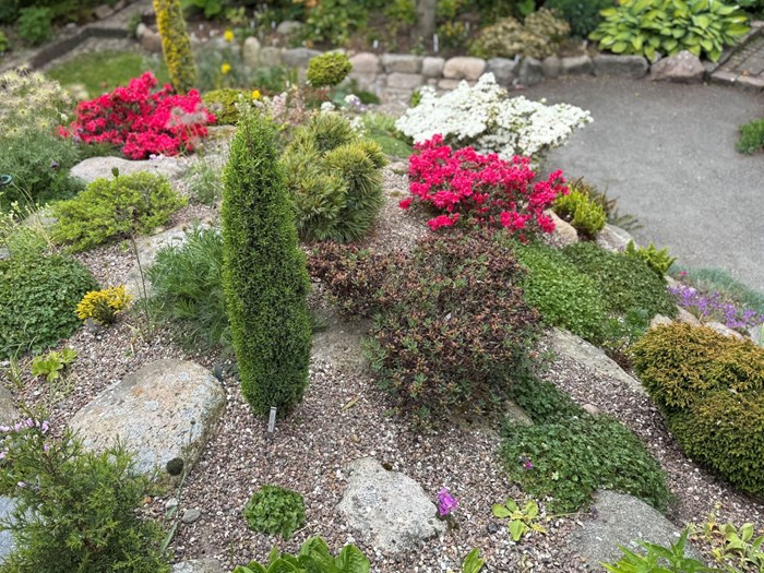 Haven består af skråninger i flere etager opbygget af tørveklyner og tilplantet med rhododendron. Indbygget i skrænten er surbundsbed med små alpine planter. Skråning med stenbed og diverse alpine planter samt små stedsegrønne træer og heksekoste. Dertil rummer haven et vandbassin med vandløb, skovbed med trillium og meget mere.