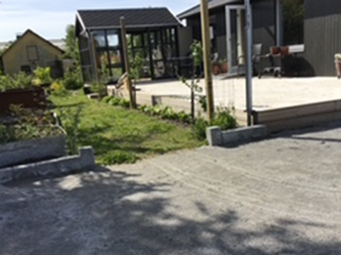 Vi fik pavillonen flyttet på to blokvogne, og gik i gang med etableringen af terrasse osv.