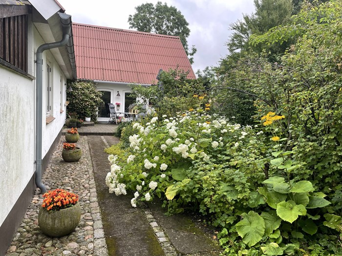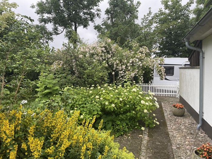 I vores prydhave er ”fredeligt” hovedtemaet. Det skal være et fristed for bekymrende verdenstanker. Et sted hvor man omsluttes af ro og fred. Derfor har vi heller ikke en masse forskellige planter og mange farver. Vi er mere til træer, buske, store stauder og ensartede flader i afstemte farver. Vi betragter vores have som et aldrig-færdigt maleri. Vores have behøver ikke nødvendigvis at være velfriseret og ukrudtsfri, men heller ikke så uplejet, at den dårlige samvittighed forstyrrer freden. Bedene bliver fornyet eller forandret, når lysten melder sig. Og det gør den ofte. Flere nye bede med forskellige temaer er kommet til de sidste par år. Mest interessant og smukt er nok vores variation af det Piet Oudolf-bed, som blev vist i Haven januar 2022.