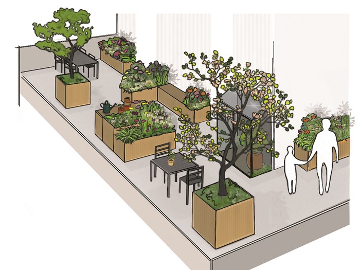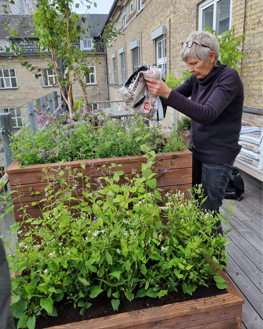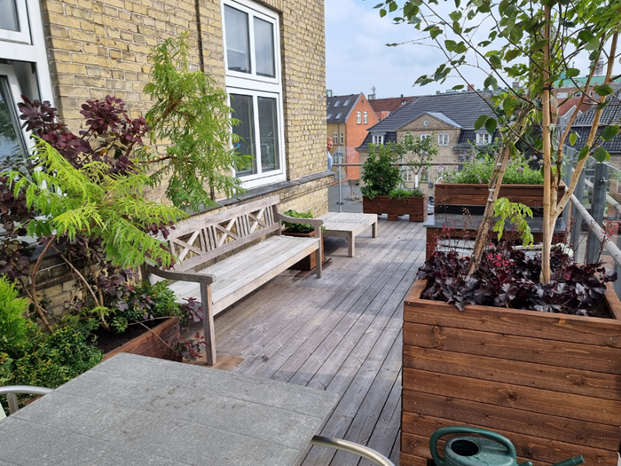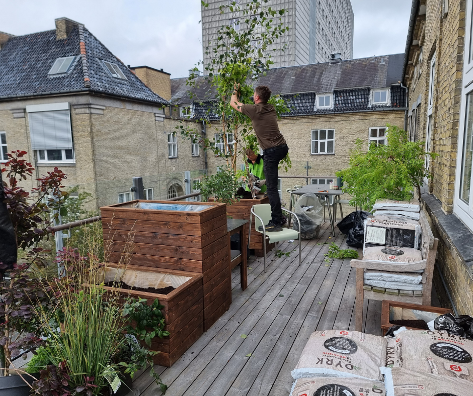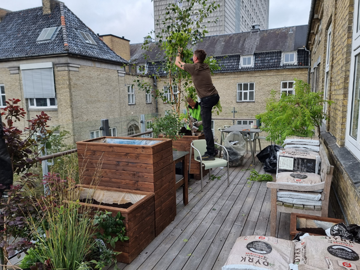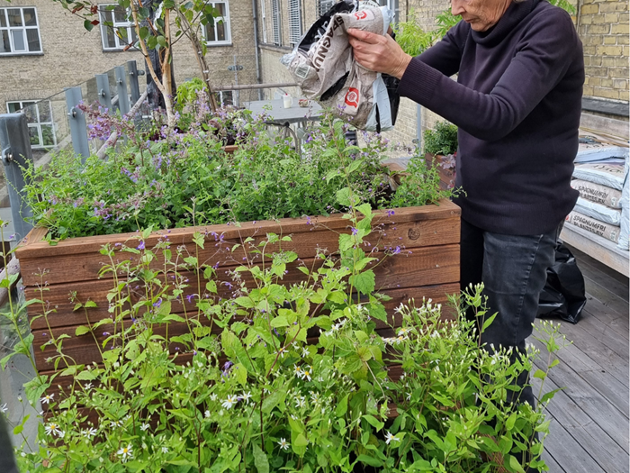 Der er en altan, der kan omdannes til et grønt område. Haveselskabet har bedt havedesigner Karina Revsbæk at udvikle en planen for det nye uderum i tilknytning til afdelingen. Haveselskabets lokale afdeling i Aalborg, anført af formand Helga Hald, påtager sig sammen med Ida Vire Tang ansvaret for at styre projektet i land.