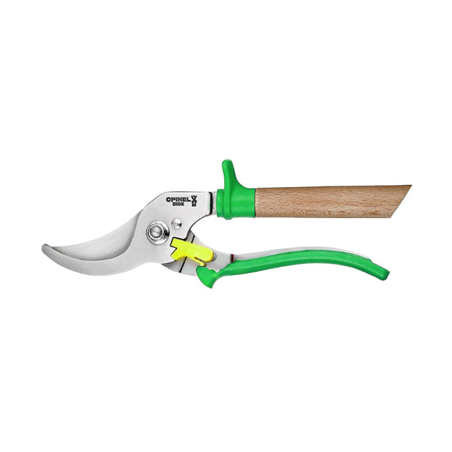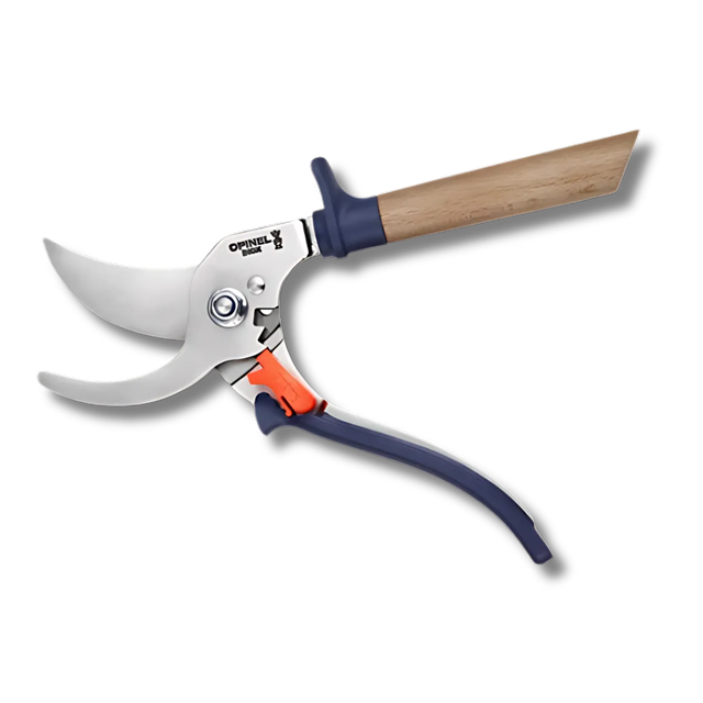 Haveselskabet fører beskæresaksen fra Opinel med et grønt og blåt håndtag.