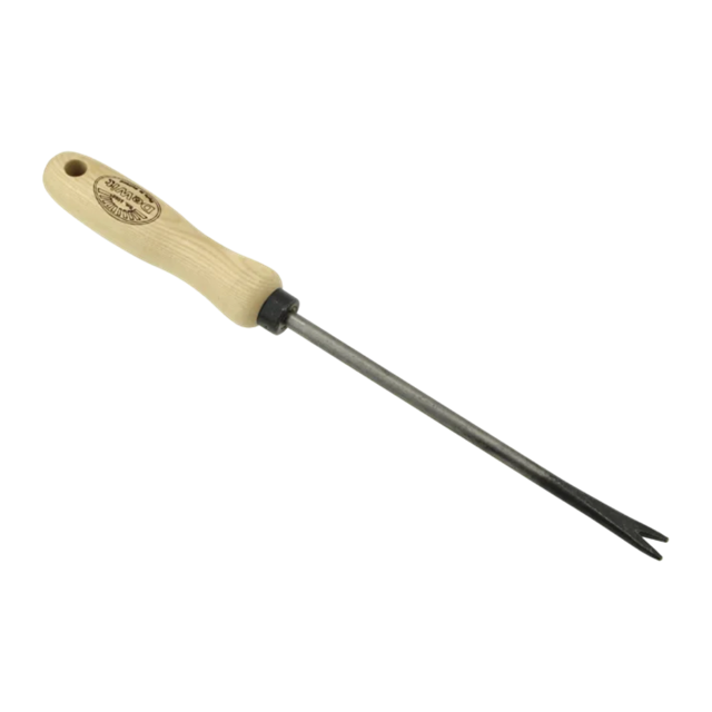 Det traditionelle lugejern, med spids som let arbejder sig ned til genstridige rødder af mælkebøtter og tidsler.