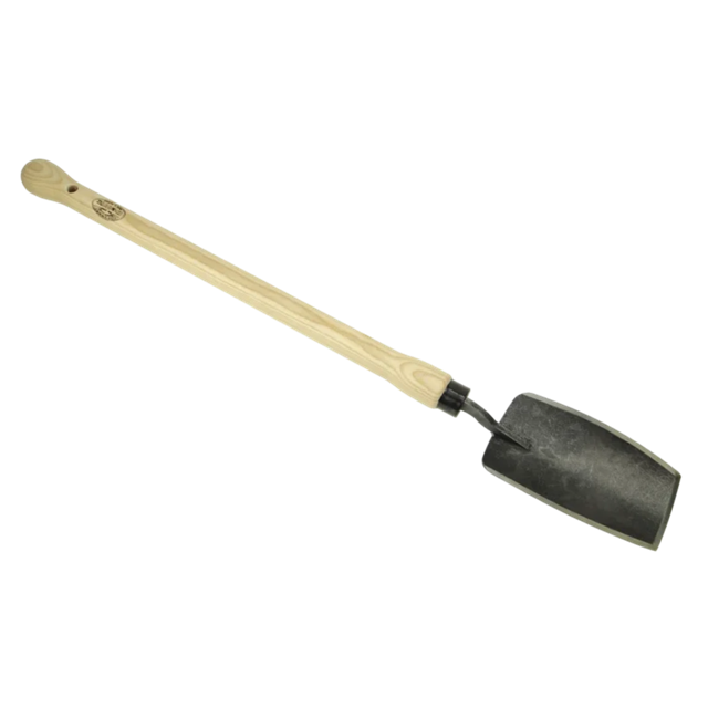Denne plantske med det lige F-skær er lavet af hærdet borstål og med knopskaft af asketræ.