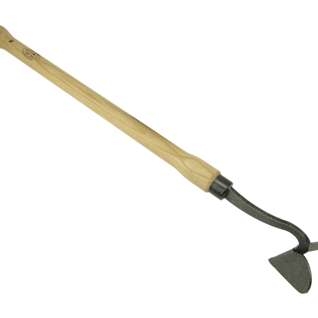 Håndploven er monteret med et 48 cam langt knopskaft, og hovedet er vinklet, så det er nemt at trække gennem jorden