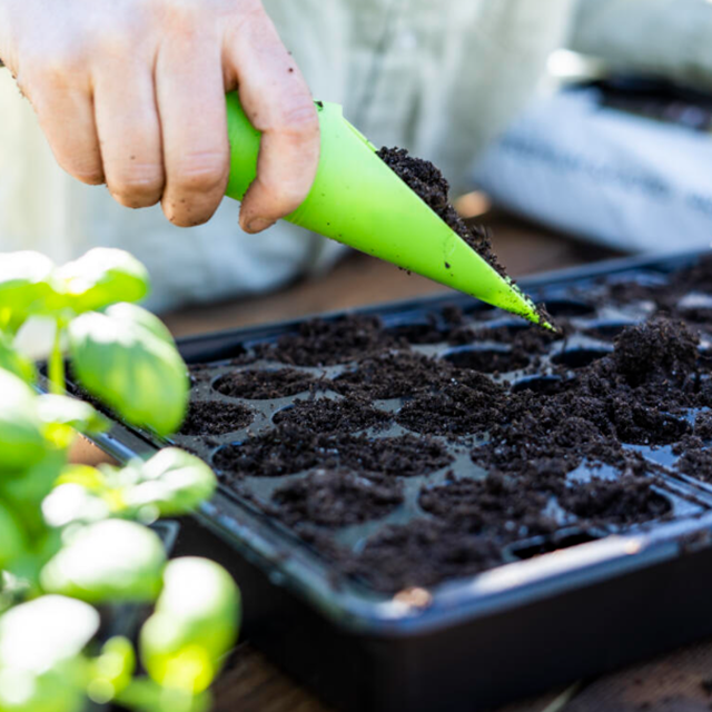 Med denne praktiske jordøse fra Nelson Garden kan du let øse jord ned i de små potter uden at spilde, når du skal forkultivere og ompotte planter. Du kan bruge jordøsens bund til at trykke jorden til.