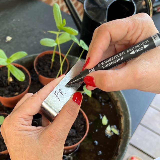 Vandfast tusch, som kan bruges til at skrive på planteskilte i metal. Planteskiltet, hvor der skal skrives på, rengøres inden. Den vandfaste tusch kan skrive med to tykkelser, i den brede ende er tuschen 2,0 mm og i den tynde ende er den 0,6 mm