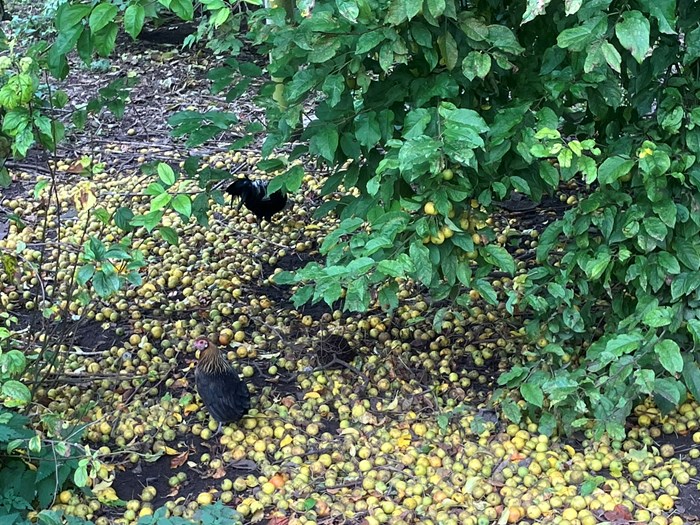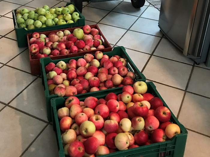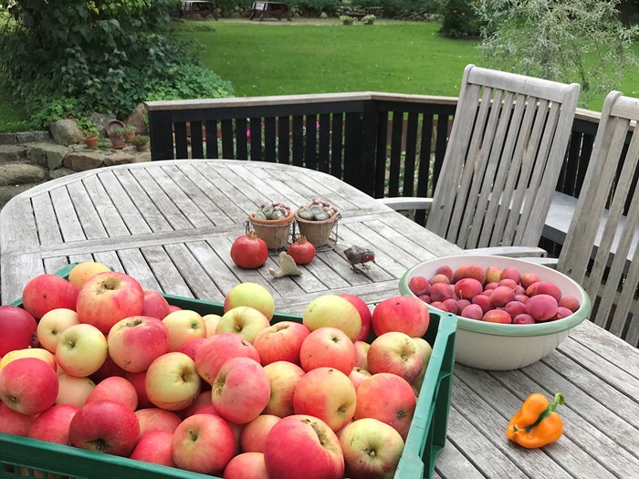Så blev æblerne høstet og lavet til 30 liter herlig juice. Det er Discovery, Annanas og Filippa. Rosen er den skønne Elaine Paige. Rosernes efterblomstring har godt nok været skøn i år. I haven ses tudser og pindsvin. At rådyrene også er der, har jeg kun indirekte beviser for:) - afgnavede roser og ekskrementer i stenene...., de er helt oppe ved huset.