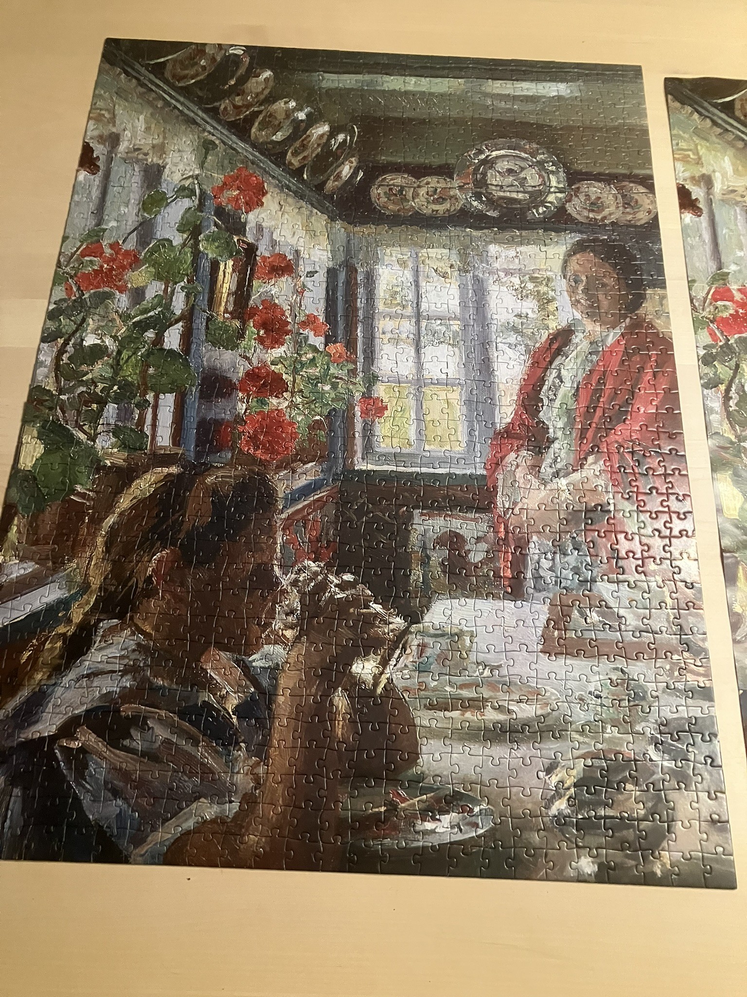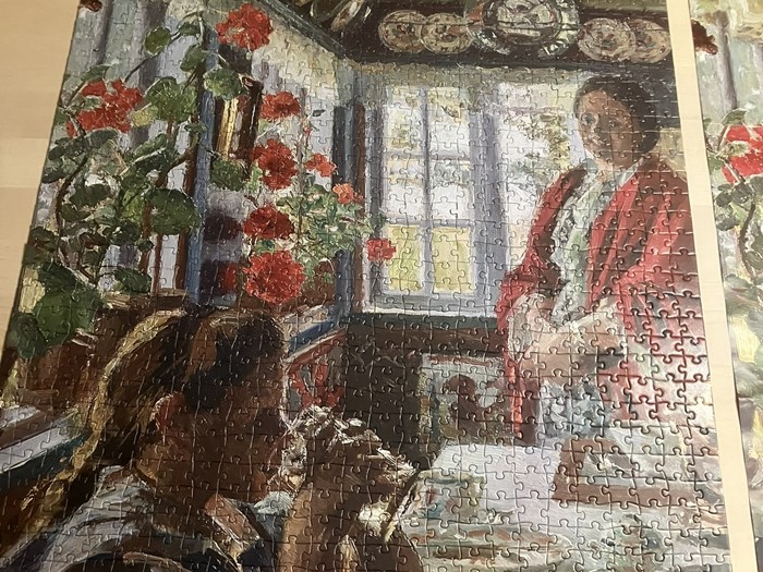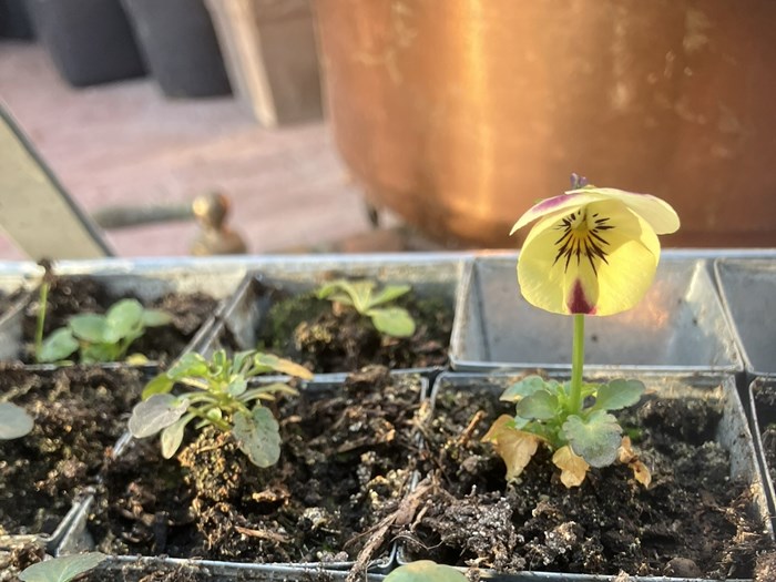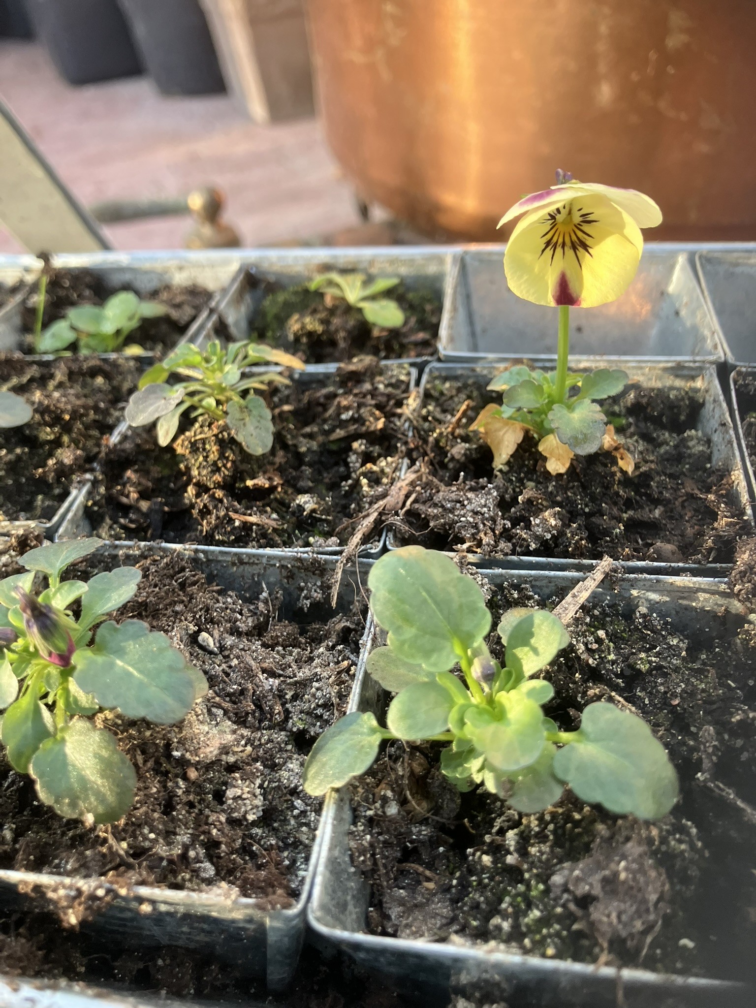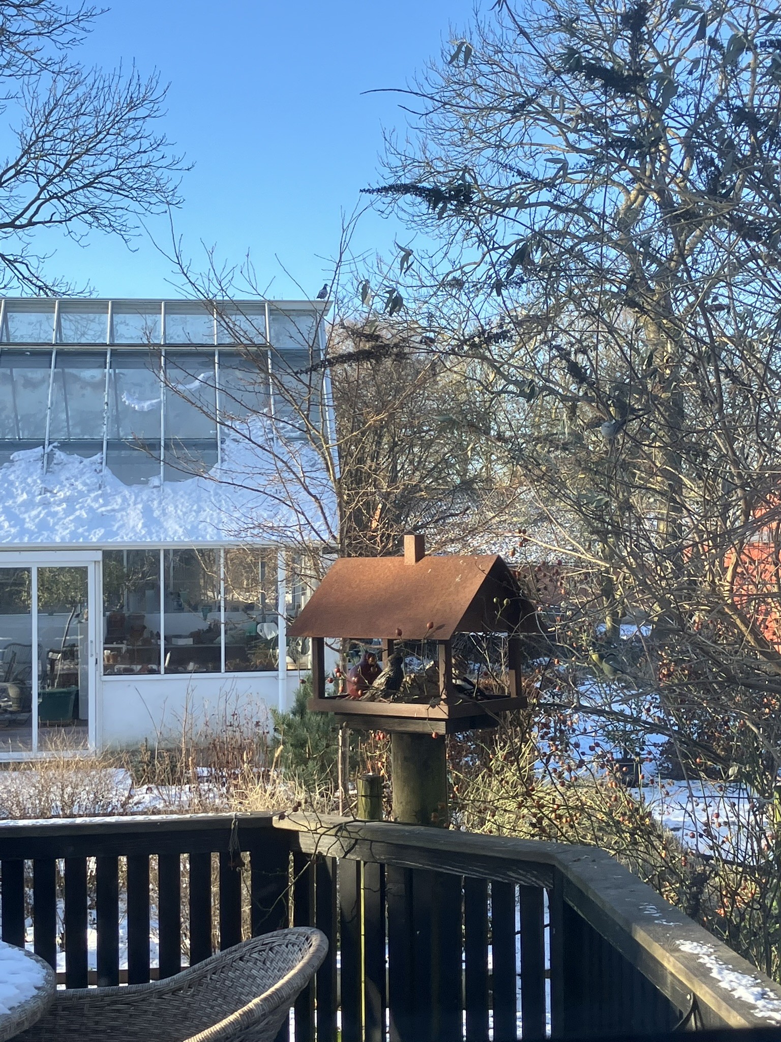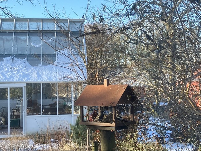 Nyt år, nyt haveår, nye planer og projekter. Hvad får du tiden til at gå med? Jeg læser og genlæser havebøger, drømmer og planlægger. Jeg lægger puslespil, her et med motiv af Laurits Tuxen, pelargonier i vindueskarmen. På solskinsdage går turen ud i haven for at spejde efter spirer og blomster. Jeg nyder hver gang synet af Vintersnebolle - Viburnum Tinus- der blomster trods den frost der har været. Enkelte primulaer og påskeklokker er også godt på vej. Stinkende nyserod lyser godt op i det visne. Det er en skøn tid. En anden god beskæftigelse for mig er at holde øje med foderbrættet, jeg ved godt at billedet ikke er så godt, men det skal forestille at være en Nøddekrige - den har jeg aldrig set tidligere, så det syns jeg er sjovt. Der sker ikke meget i drivhuset, men stedmorsblomsterne er begyndt. Der er selvsåede planter jeg reddede mellem stenene på gårdspladsen. Vi kan vel ikke afvise at sneen kan komme tilbage, men så tager vi det med.