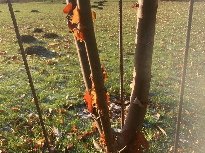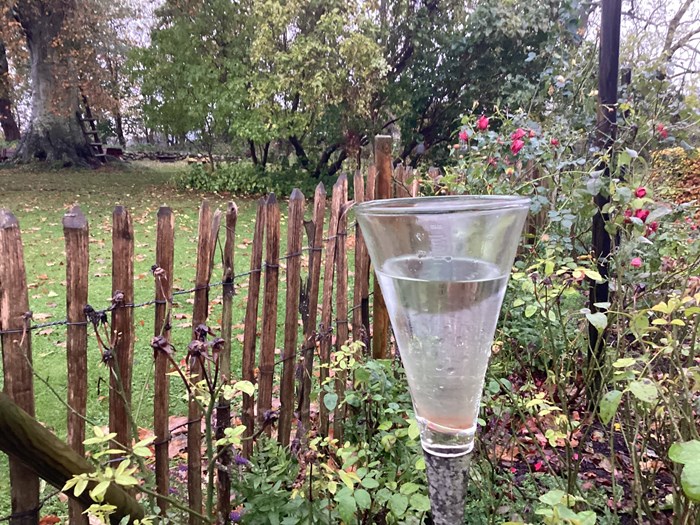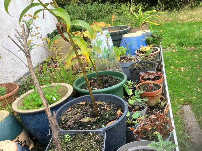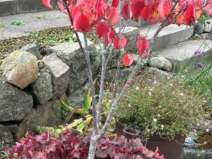Hvor er det dog nogle herlige havedage her i oktober, mildt vejr og jorden hos os er tilpas fugtig og let at arbejde med. For en gangs skyld har jeg fået gjort flere bede vinterklare med lugning og omplantning. Det er en dejlig fornemmelse. Der står virkelig meget skrevet om beskæring af træer og buske, både om hvordan og hvornår det er bedst. Det kan jeg ikke tage mig af - jeg beskærer bare når jeg kommer forbi noget, der lige der og da, ser ud til at trænge til at blive studset eller fortyndet. Ofte prøver jeg at lave stiklinger af det jeg klipper væk - og nogle gange lykkes det.... der er et billede af en lille koreakornel jeg selv har lavet. Lige som mange andre har vi haft overflod af æbler i år. Der er lavet juice og mos. Alligevel er der en stor del der falder ned til glæde for høns, rådyr og andre, men vi har så en daglig opgave med at befri vores robotklipper der ikke kan tygge sig igennem de store æbler. Jeg syns ellers vi er flittige til at samle op.