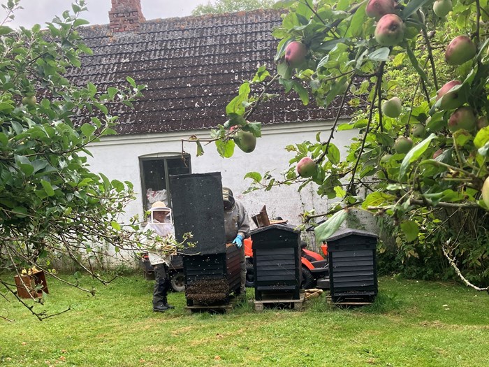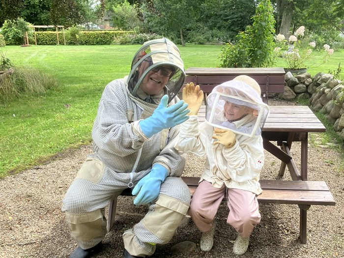 Nu vil jeg ikke skrive om alt der ikke lykkedes i sommer, men nyde det der er gået fint. Hjortetrøsten og kvæsurten trives og klæder hinandens selskab godt. Barnebarnet Mathias hjælper morfar med bierne - en fin høst. Jeg fandt denne flotte trådkurv på et loppemarked, men min kreative sans rækker ikke længere end til at bruge den til kogler eller røde æbler. Gode idéer efterlyses. Måske ses vi på Havemarked Rønnebæksholm?