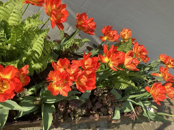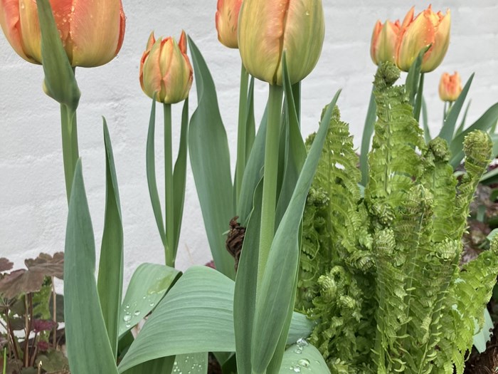 Jeg tog chancen og flyttede alle pelargonier ud i drivhuset - det gik godt- heldigvis. Inspireret af det fine foredrag med Pelargoniepigerne så talte jeg dem jeg har - ca. 60 stykker. Ikke alle er forskellige, men alligevel, det kom bag på mig at det var så mange jeg har. Indenfor er vindueskarmene nu herligt tomme. Vi har rabarber nok, som I kan se på billedet, får desværre ikke brugt så meget af den, men flot er det. Der sker meget på de to uger der er mellem de to billeder af de skønne orange tulipaner som I kan se. Kan ikke huske navnet på dem. Og så skal I da have et billede af Kærmindesøster 'Jack Frost' Til min store glæde har vi igen i år fået haletudser i bassinet, til trods for alt for mange fisk. Nogen der vil have nogle fisk?