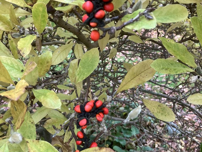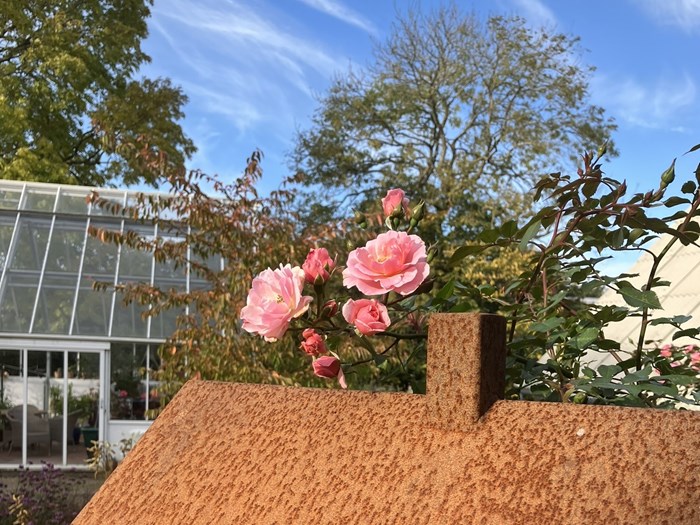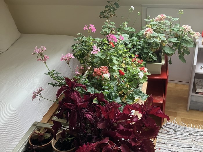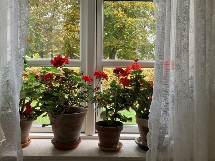 Endelig har jeg fået indhentet lidt af det forsømte i haven. Det er vel nok flot med de gyldne blade, og vi har ikke haft blæst af betydning, så de ligger der endnu. Jeg river kun blade sammen på grusbelægningen, andre steder må de blive liggende. Hvad gør I? Den smukke klatrerose Nordina blomster lige til frosten kommer. Det sidste i drivhuset blev ryddet i går med hjælp af børnearbejde:) To børnebørn hjalp til med at flytte ca. 70 pelargonier indenhus. De hentede de sidste caféstole og høstede de få Ingrid Marieæbler der ikke var spist af fuglene. Det sidste billede er fra Haveselskabets formandsmøde 2. november. Det viser hvilke foredrag vi kan glæde os til i 2025, hvor og hvornår (jeg tror nok der er forbehold for evt. rettelser).