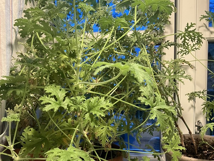 Så er der gang i så og prikling. Se min smarte genbrugsløsning af plastpinde: nummer på pinden og på frøposen. Jeg er virkelig ikke af den tålmodige type, hvad angår så og prikleplanter med hensyn til tilskudslys, afhærdning og så videre, så frøene bliver sået, priklet og sat ud i drivhuset, evt. med en dug over hvis der bliver koldt eller solen skinner for skarpt. Til gengæld må jeg så leve med det tab der naturligvis kommer. Jeg glæder mig til foredraget med Pelargoniepigerne den 30. april, for som I ser på billedet af min duftgeranie, kan jeg godt bruge lidt vejledning til hvordan den kan klippes. Er en duftgeranie for øvrigt en pelargonie? I haven nåede jeg lige at klippe (men ikke rydde grenene op) og gøde roserne før den kraftige regn kom. Den gødning jeg bruger til roser er et par skovlfulde fra gulvet i hønsehuset, dem blander jeg godt op med sand (ligner smuldredejg til tærter) og så giver jeg en lille planteskefuld til hver rose.