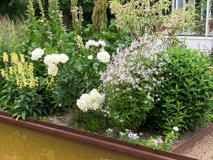 Haven i juni 2023 Nu er det allerede midt juni, tørken har ramt hårdt i år. Roserne og silkepæonerne er godt i gang. Det er andet år vi har vores havebassin. Vi satte 20 fisk ud sidste forår, blandet guldfisk og koikarper. Der har resulteret i mere end 50 småfisk. Hvad gør vi ved dem - det er jo alt for mange? Nu kommer løsningen måske af sig selv, for se lige på billedet hvad vi har fået besøg af - en snog på ca. 60 cm! Den har vi aldrig set på vores ejendom tidligere. Og vil den lille frø overleve besøget? Måske bliver der en naturlig balance..... Jeg glæder mig hvert år til at plukke en lille buket af de skønne velduftende ærteblomster. God sommer.