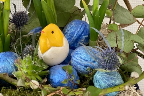 Valnødder er malet i blå og grønne nuancer -de ligner æg. mos i bunden, en troldpilegren og diverse små blomster. Jonna Krouels eget påskeæg. Foto Jonna krouel