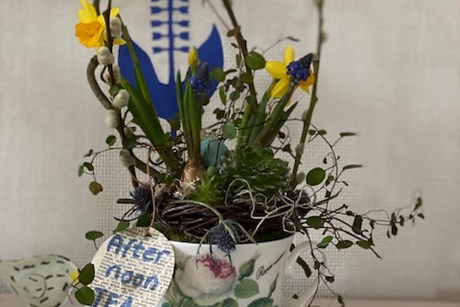 En pletter i luften ned i koppen, derefter pilegrene, æg og blomster. Æg dekoreret af Jonna Krouel. Foto Jonna Krouel