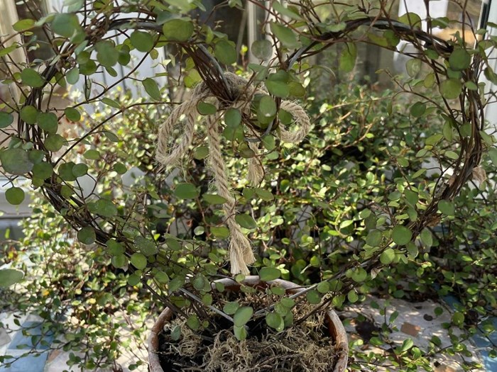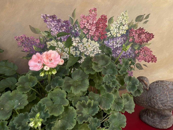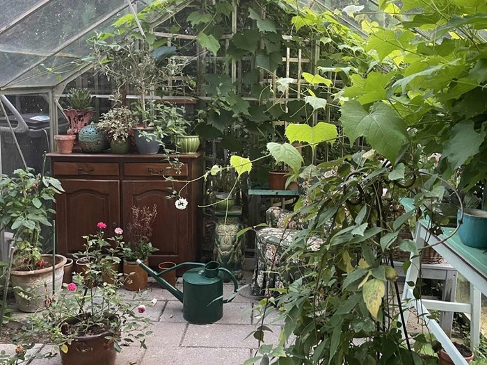 Et herligt krukkerum, hvor der kan arbejdes med ompotning af de mange sommerblomster samt et drivhus, der fuldende havens glæder, og som gør at vi aldrig bliver arbejdsløse her.