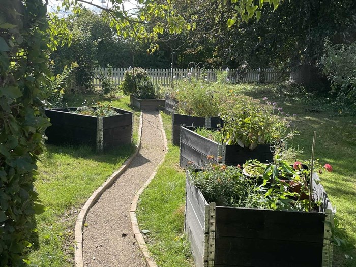 Bag huset er haven i flere niveauer. Nederst var der et dybt bassin som nu er omdannet til staudebed.