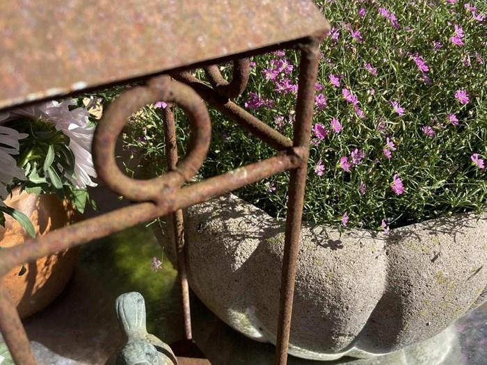 Forhaven var først tænkt som lege-boldbane til børnebørnene, men fornylig inddrog vi pladsen til højbede med sommerblomster og stauder. En lille gårdhave støder op til forhaven, og der bliver konstant kælet for den - ikke fint og moderne- mosset får lov at pible op mellem de originale fliser, og krukker og planter, figurer og andre artefakter flytter ind.